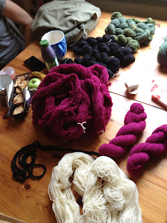 En del hänger fortfarande på mitt element och torkar, men det blev en hel del tjusiga garner. Det hiskeliga rosa blev mörkt augergine-färgat, och en massa av det vita blev en snygg blå. Ett gäng äppelgröna härvor av Rowans Calmer är numera en snygg svart med lite spräckliga inslag av grafit.